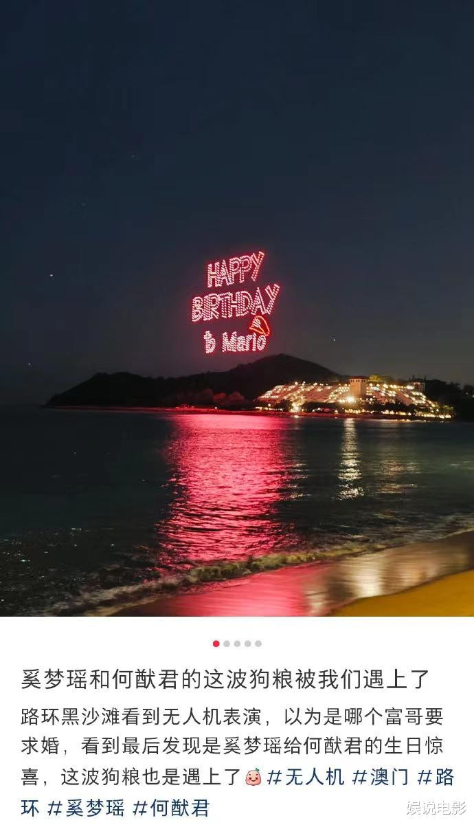 网友爆料,在澳路途环黑沙滩看到奚梦瑶为老公准备的无东说念主机扮演,认为是霸总求婚,思不到是奚梦瑶为老公庆生,看来他们一家皆在澳门庆生。