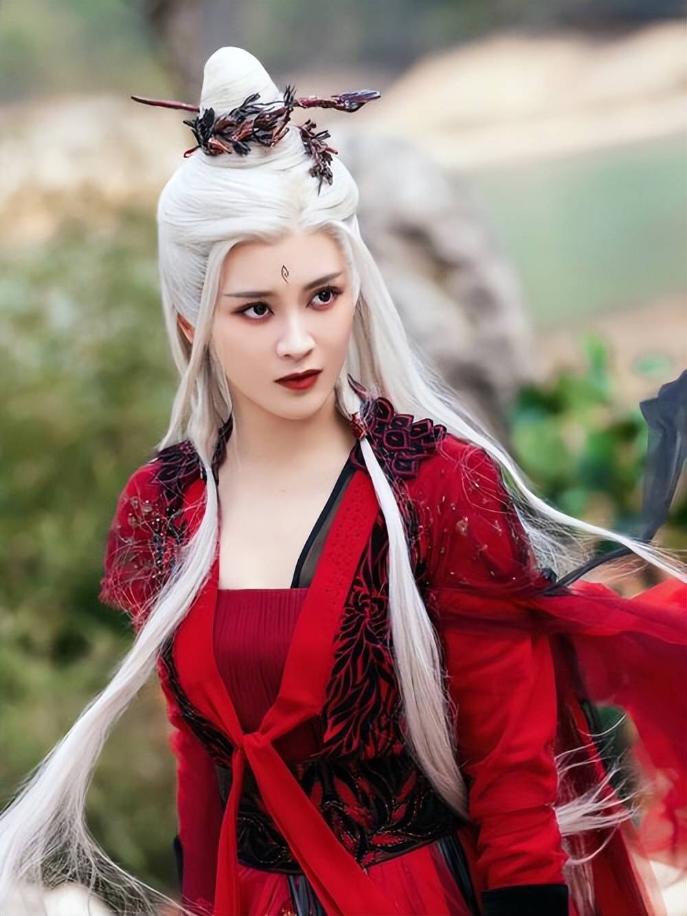 《长月烬明》饰演魔神身边的奉陪者姒婴。红衣鹤发加上大浓妆,十分惹眼。还有寂寞紫衣装饰也很面子,照旧剧中打戏担当。