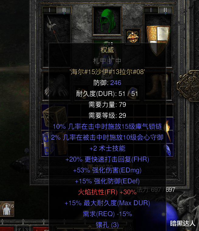 衣裳:暗藏,2孔灰色衣裳,符文规章7号(塔尔)+5号(艾斯),或者暗金海蛇皮甲、天梯新增符文之语“泰斗”(3孔灰色衣裳,15号海尔+13号沙伊+8号拉尔),大后期换成符文之语谜团。