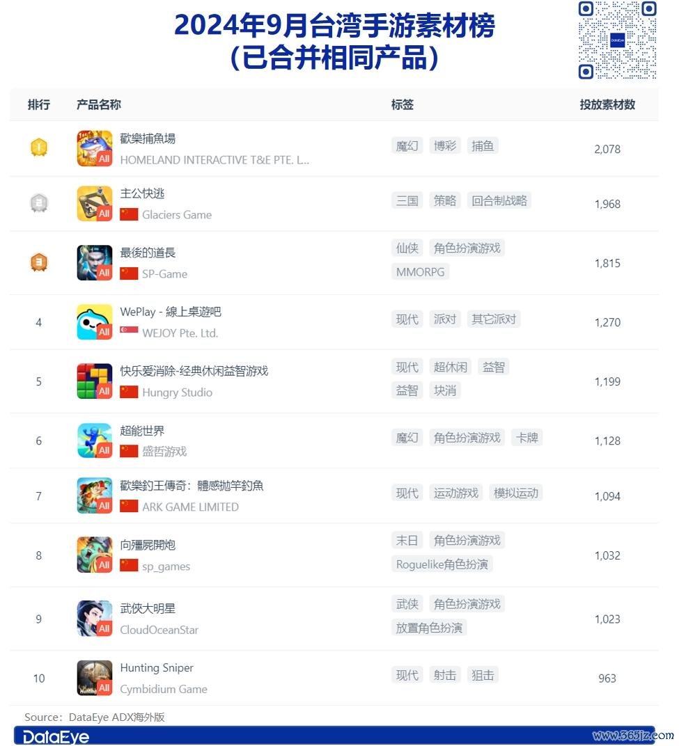 在9月的台湾手游买量榜上,《郁勃哺育场》以2000组的素材量排第一,冰川游戏和露水游戏分列二三,构成第一梯队。乐游方舟的《歡樂釣王傳奇:體感拋竿釣魚》在9月份加大了投放力度,其素材创意也极端故理由。