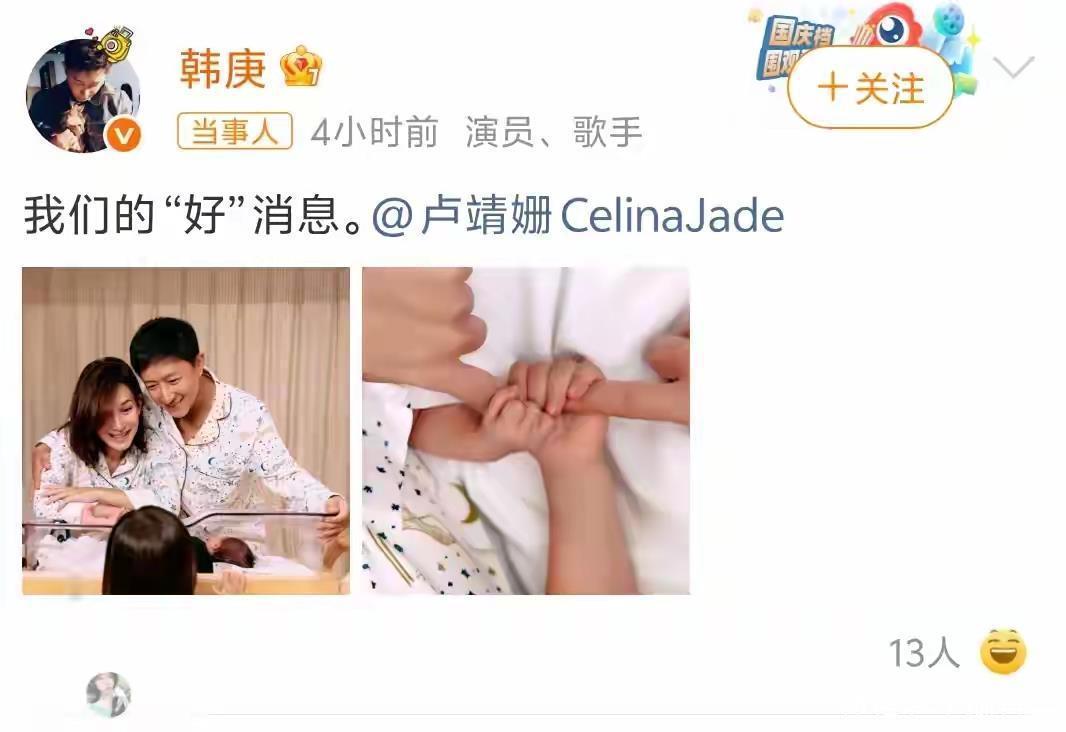 他俩责任室官方发文说:“韩庚先生与卢靖姗女士喜迎二胎,母女吉利。感德民众的珍重与祝贺,改日也会持续看管好小家庭,稳步前行。” 还配了一家三口的温馨合影。
