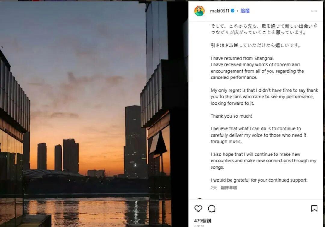 大槻真希用日文和英文写谈:“我已从上海记忆。对于上演取消,我收到了巨匠好多眷注和饱读吹……十分感谢!”