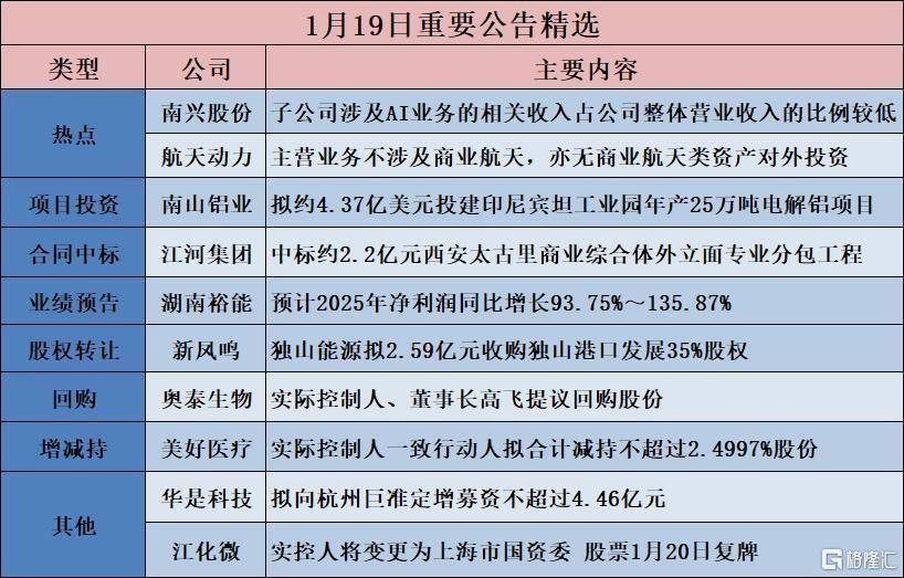 金隅集团(601992.SH):“交易航天”有关业务占比极小南兴股份(002757.SZ):子公司波及AI业务的有关收入占公司举座营业收入的比例较低航天能源(600343.SH):主营业务不波及交易航天,亦无交易航天类财富对外投资【神志投资】南山铝业(600219.SH):拟约4.37亿好意思元投建印尼宾坦工业园年产25万吨电解铝神志长源电力(000966.SZ):拟增资全资子公司并投资诞生湖泗光伏神志【中标条约】平治信息(300571.SZ):预中标4.89亿元神志双良节能(600481.SH):中标2.36亿元宁夏电投石嘴山2×660MW超超临界热电神志表凝式当然透风障碍空冷系统招标神志江河集团(601886.SH):中标约2.2亿元西安太古里交易概括体外立面专科分包工程(1B标段(二区))神志【功绩预报】好上好(001298.SZ):瞻望2025年净利润同比增长115.64%-175.35%福莱蒽特(605566.SH):瞻望2025年净利润同比增长81.67%至127.08%远翔新材(301300.SZ):瞻望2025年净利润同比增长76.27%~107.37%湖南裕能(301358.SZ):瞻望2025年净利润同比增长93.75%~135.87%【股权收购】网赌足球app