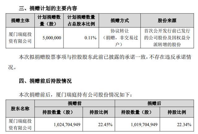 IT之家 4 月 1 日音书,宁德期间 3 月 31 日发布对于控股鼓动无偿捐赠部分公司股份的公告,公司控股鼓动厦门瑞庭投资有限公司(简称“厦门瑞庭”)捏有公司 1,024,704,949 股 A 股股份,占公司总股本的 22.45%。
