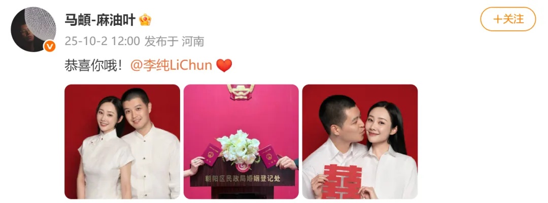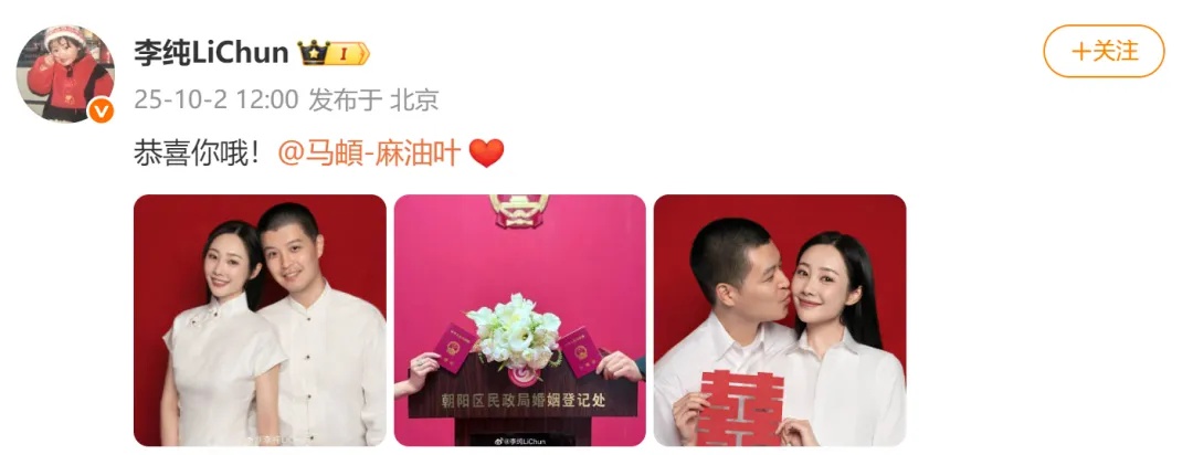 10月2日中午,演员李纯和歌手马頔在个东谈主社媒同步发文“恭喜你哦”并晒照,官宣成婚。