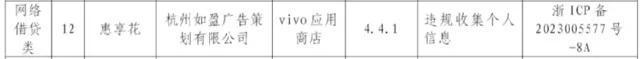 近日,浙江省通讯经管局了一批侵害用户权柄动作的App(小武艺),名单中13款违纪欺诈因未按条目完成整改被给以通报。其中,一款名为“惠享花”的荟萃假贷类App在列,触及的问题为“违纪汇集个东谈主信息”,分发平台为vivo欺诈商店(版块4.4.1),开辟主体为杭州如盈告白商酌有限公司(下称“如盈告白”)。